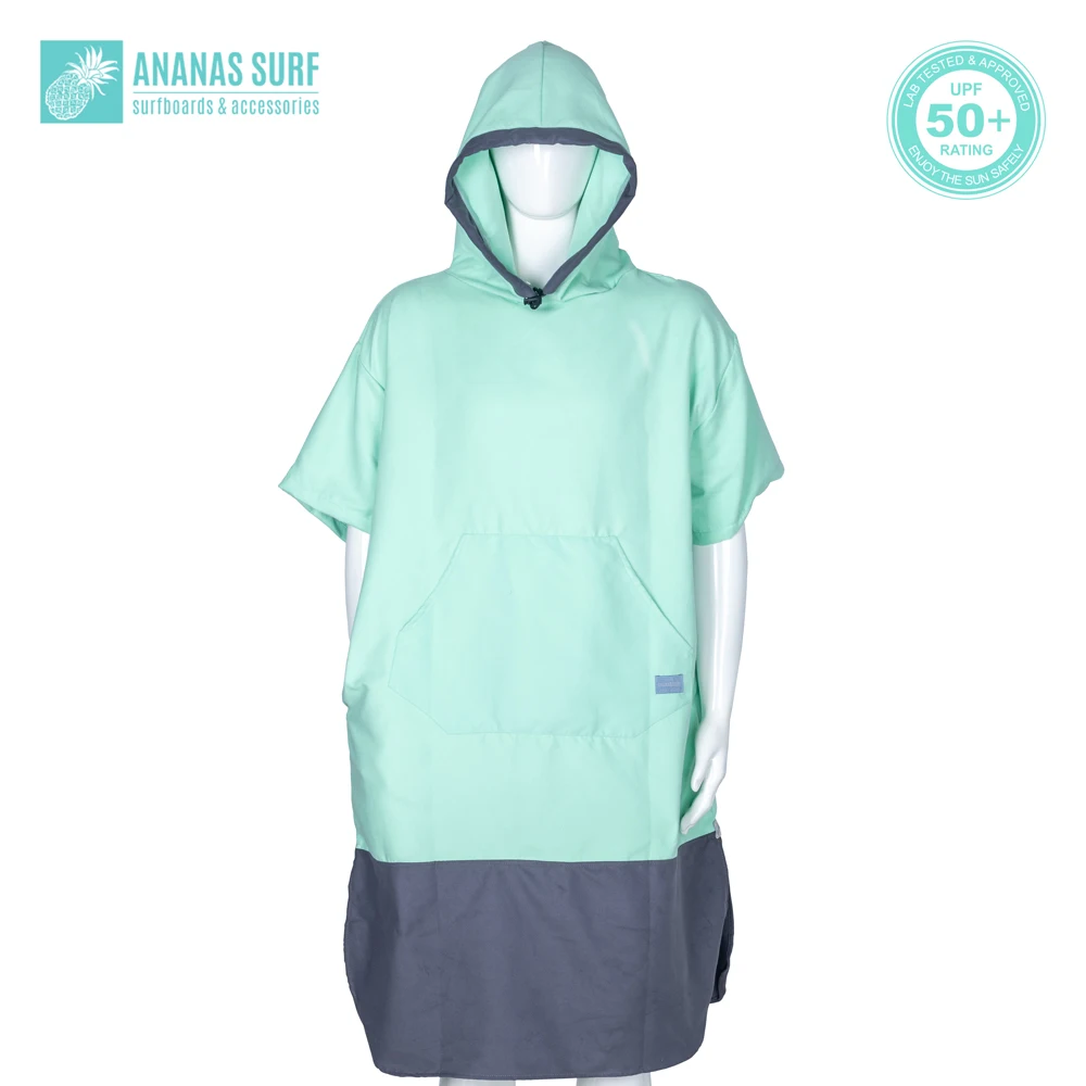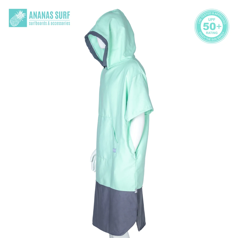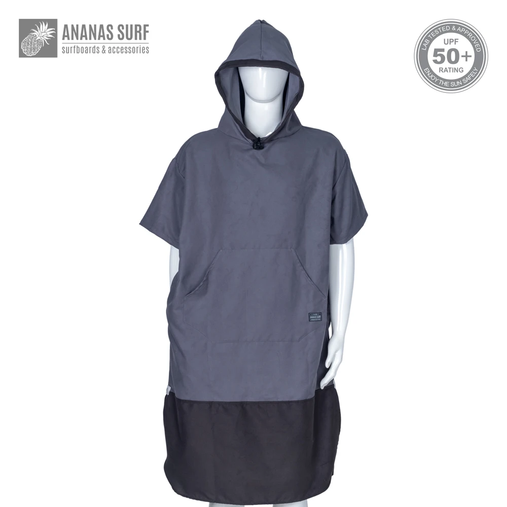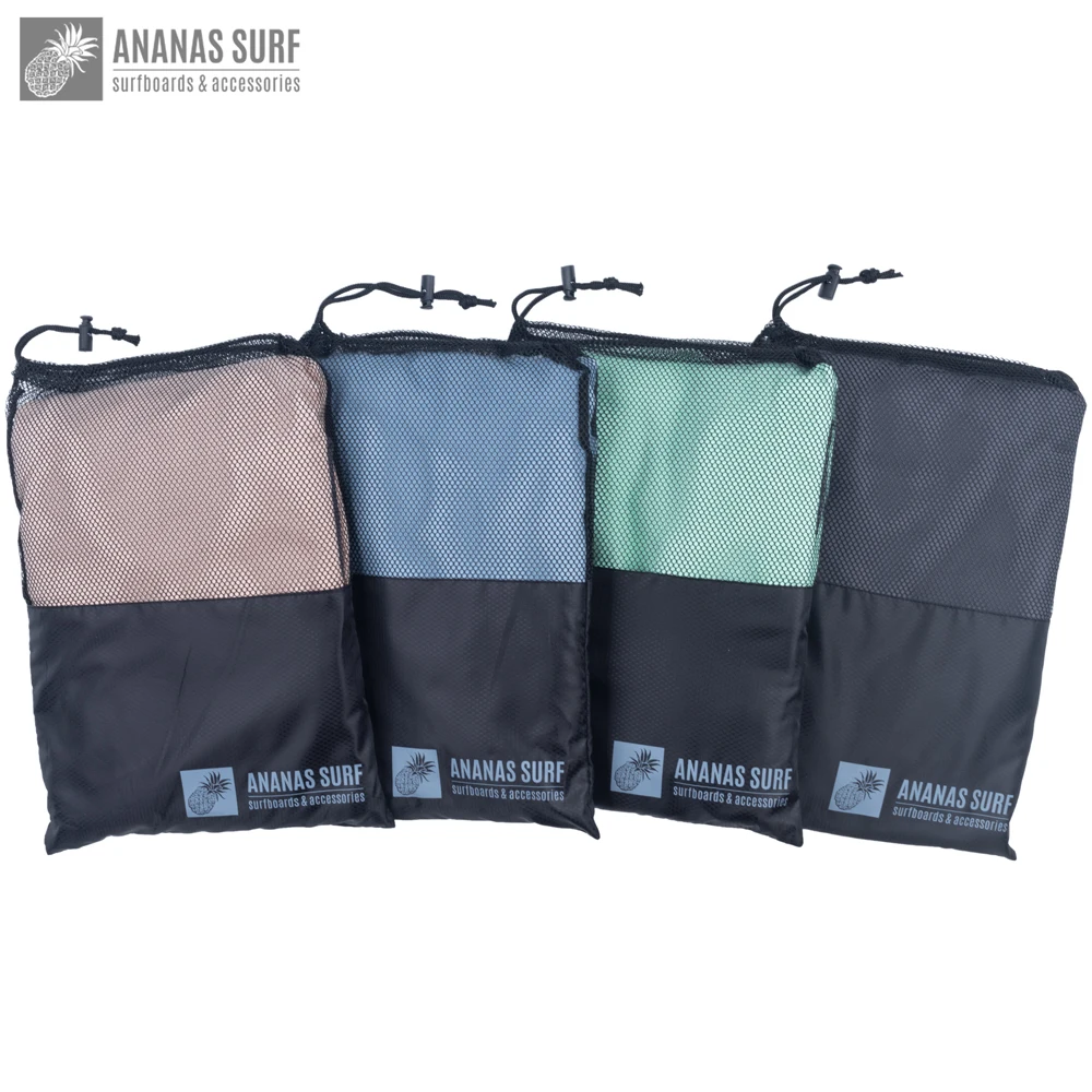ANANAS SURF beach poncho with open side pocket for easy changing your wet wear is made of quick-drying and super lightweight microfiber suede cloth materials. So also can be used as a beach towel. It’s real small packing size, you’ll always find someplace on the beach for the change you wet wear after surf. Just put it in your bag to bring a poncho along to the spot!